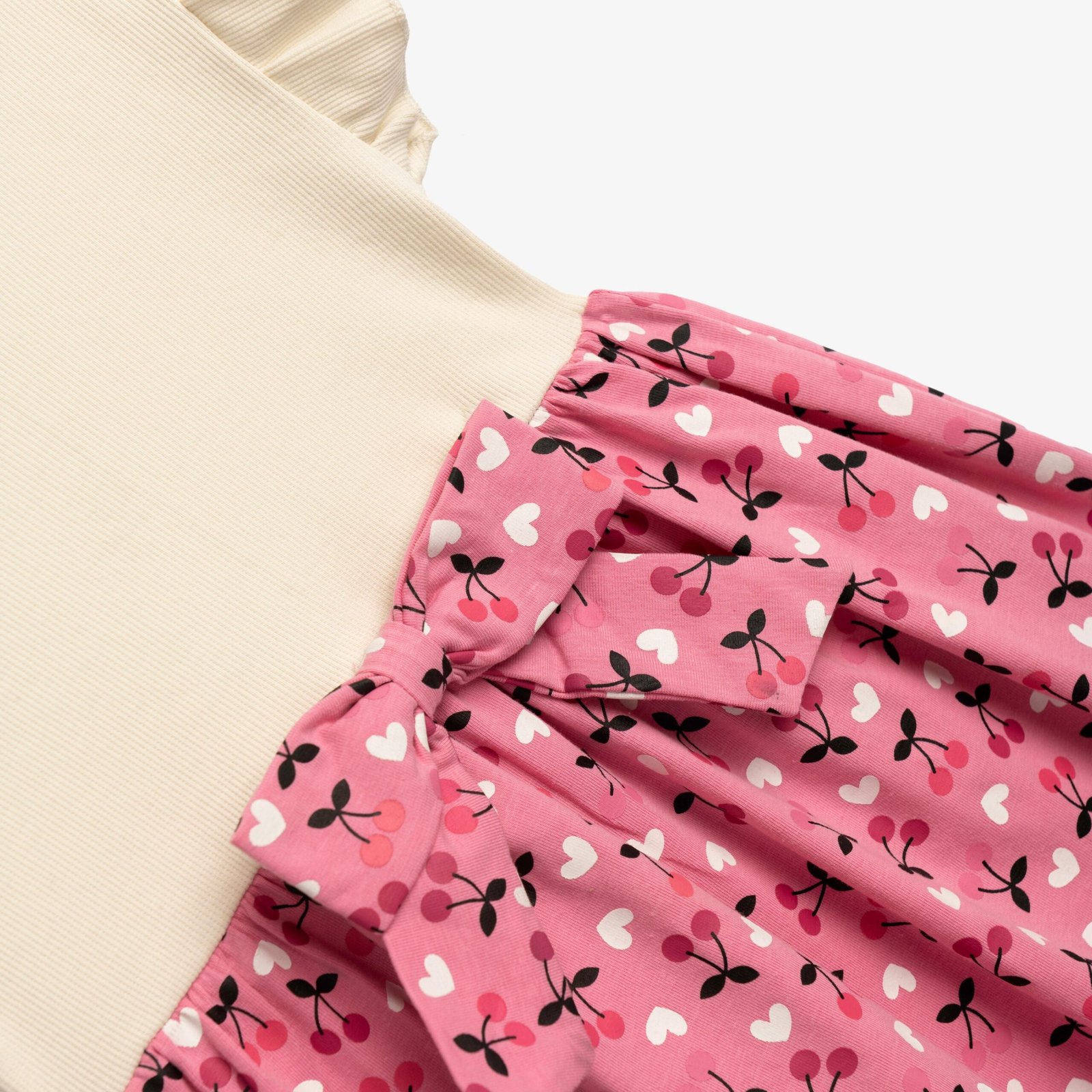 Φόρεμα κάλτσα λύκρα και ριπ με τύπωμα (κεράσια) allover σε χρώμα εκρού-candy pink για κορίτσι 1-6 ετών.